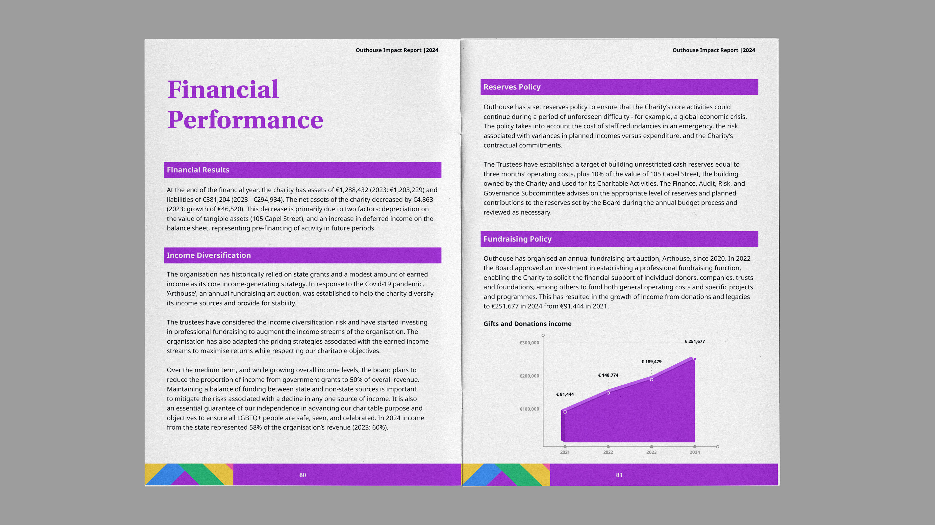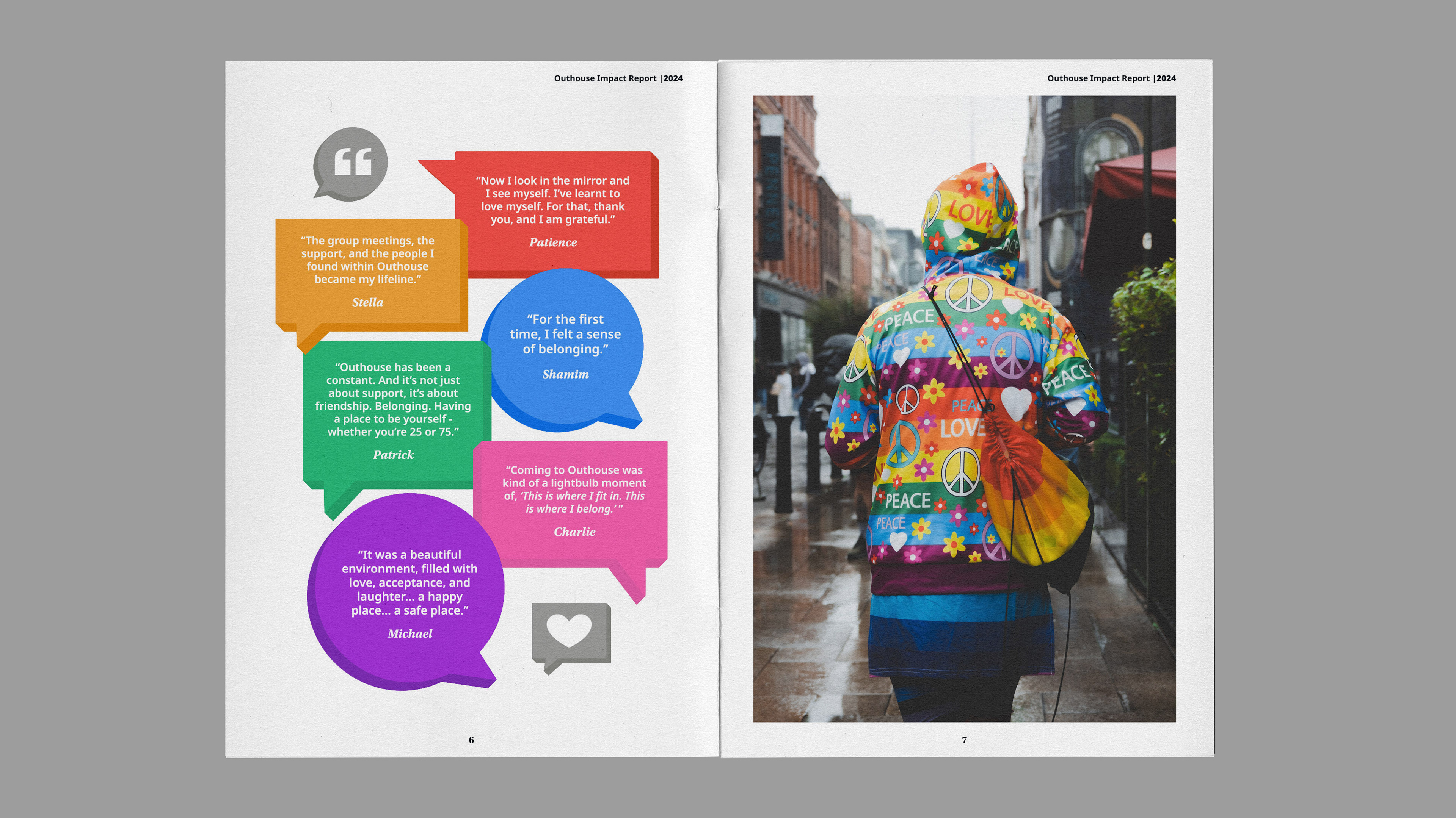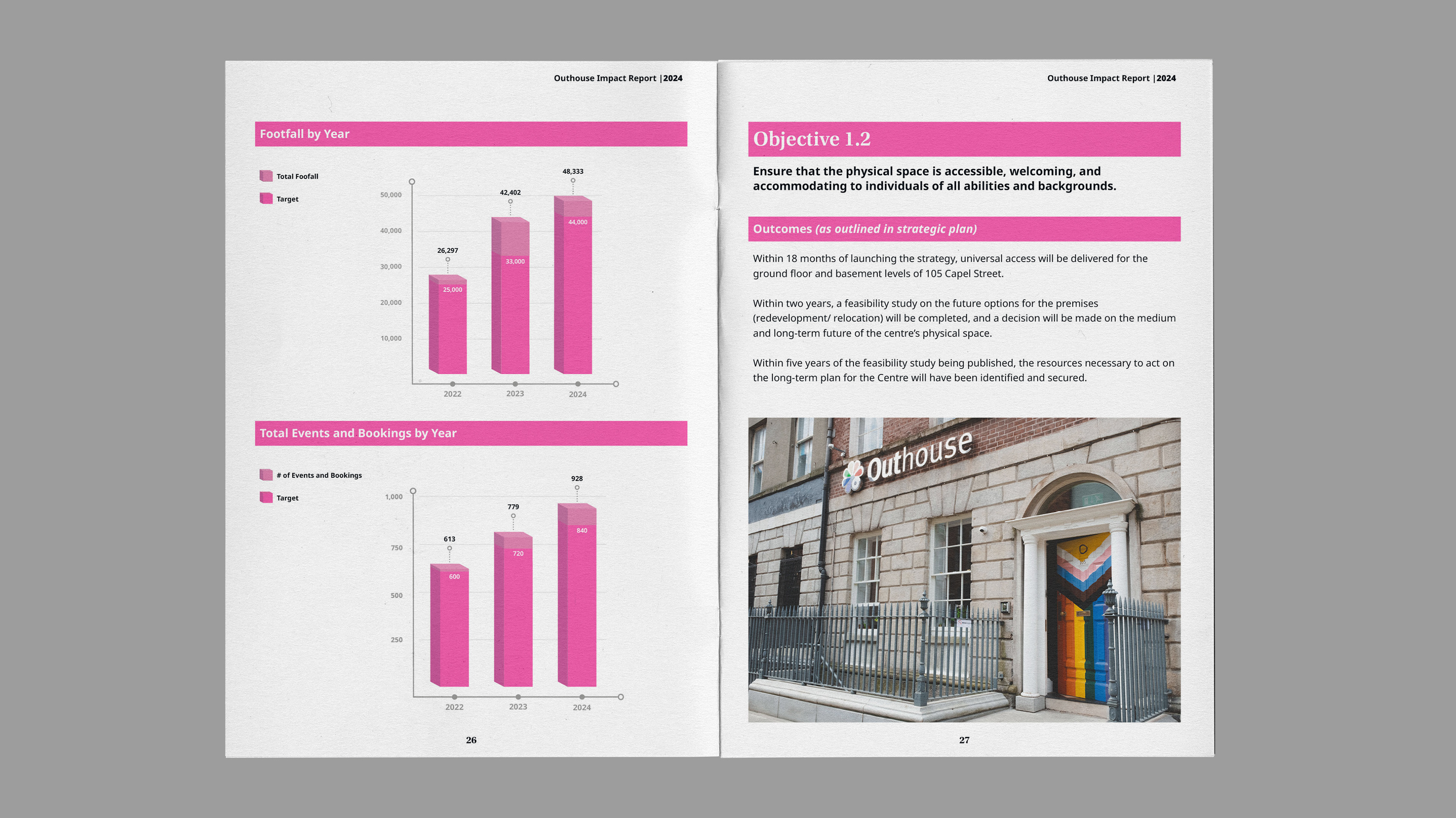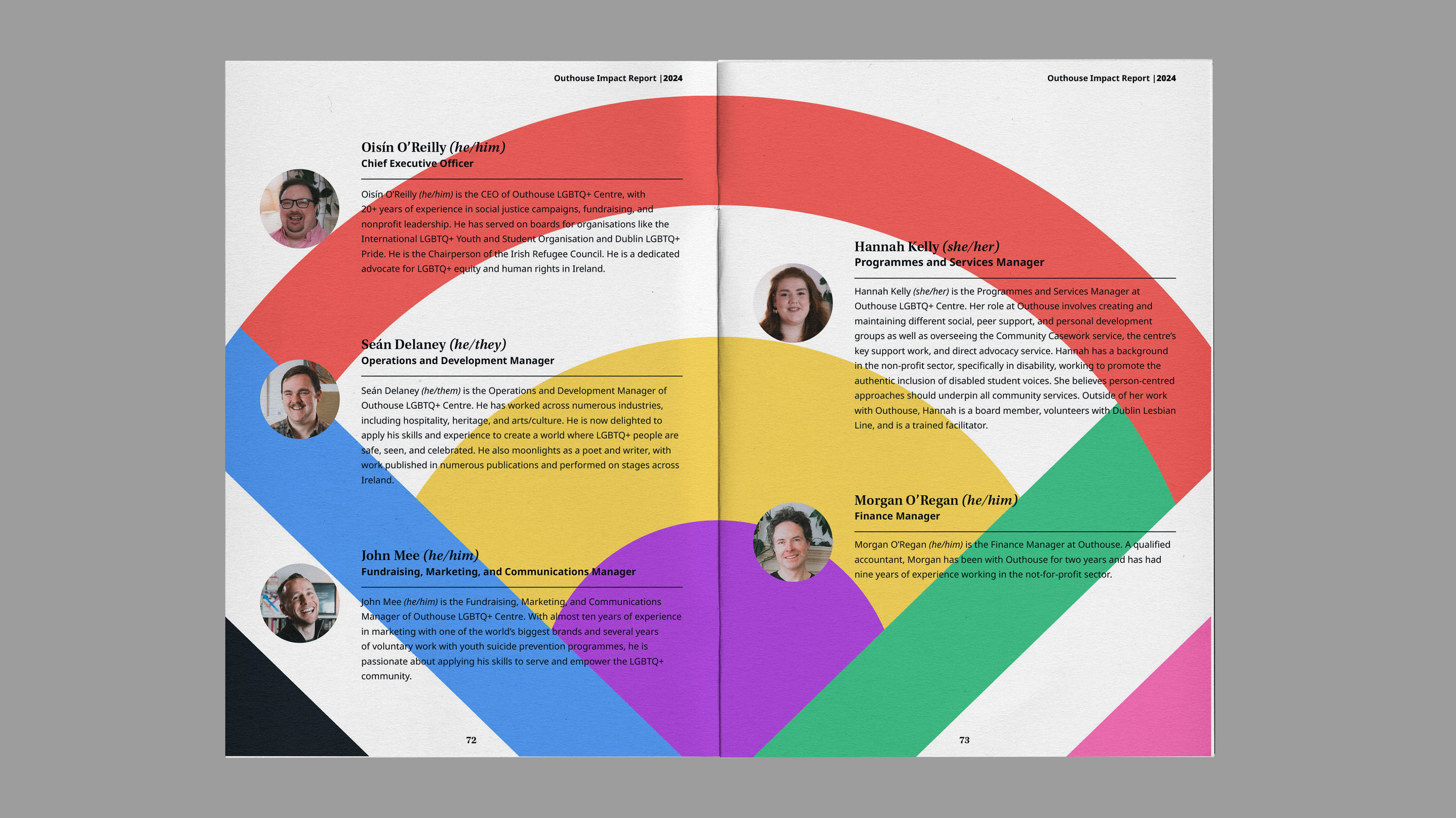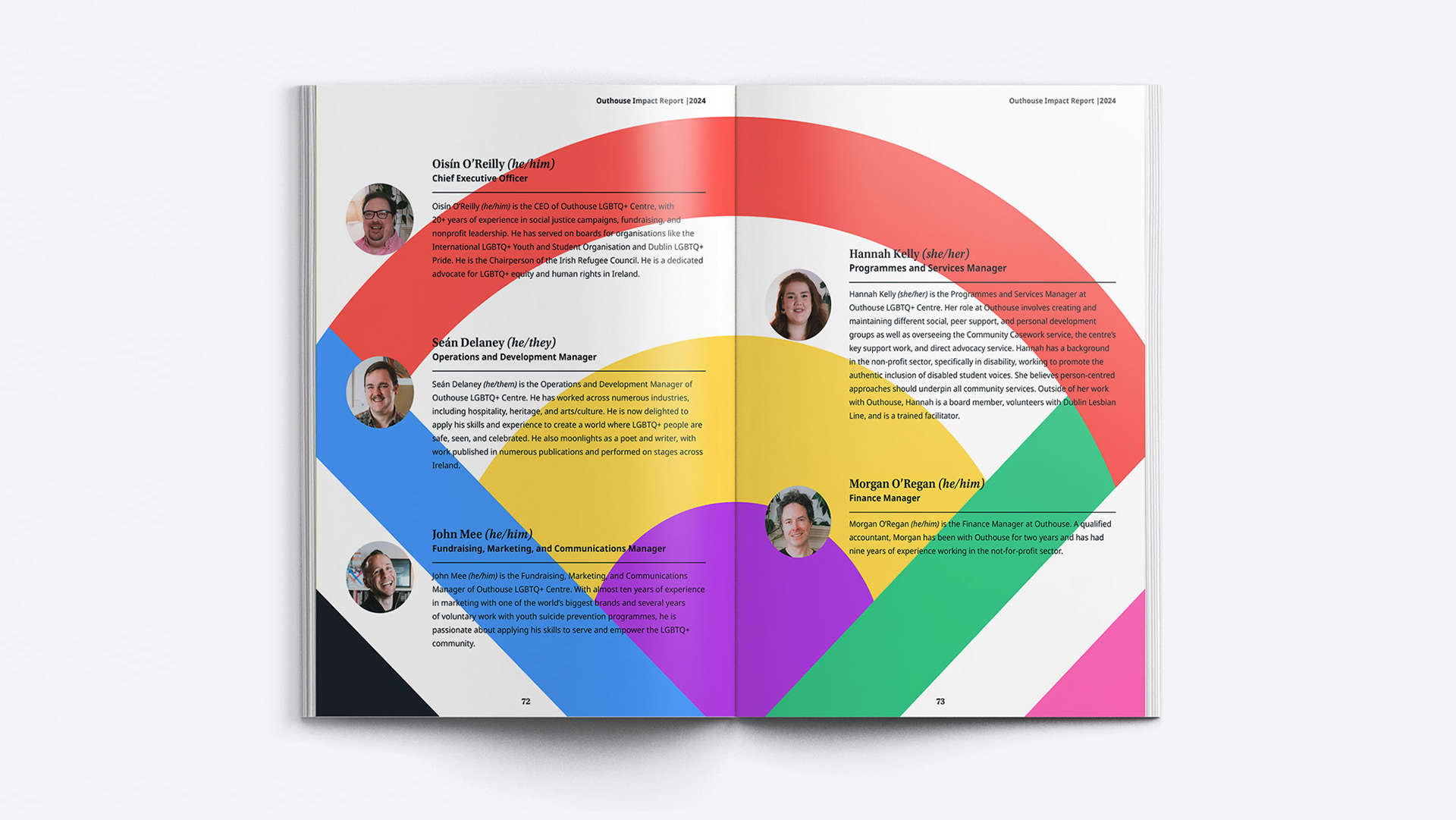 Outhouse, a leading LGBTQ+ community centre in Dublin, reached out to us to design their 2024 Annual Impact Report. The goal was to transform a text-heavy, formal publication into a visually engaging document that reflects the organisation’s identity and commitment to inclusion.