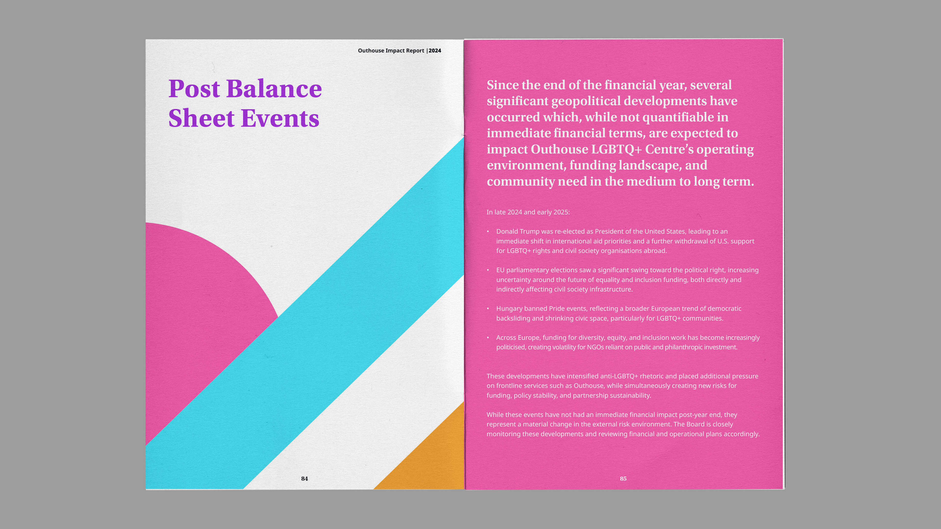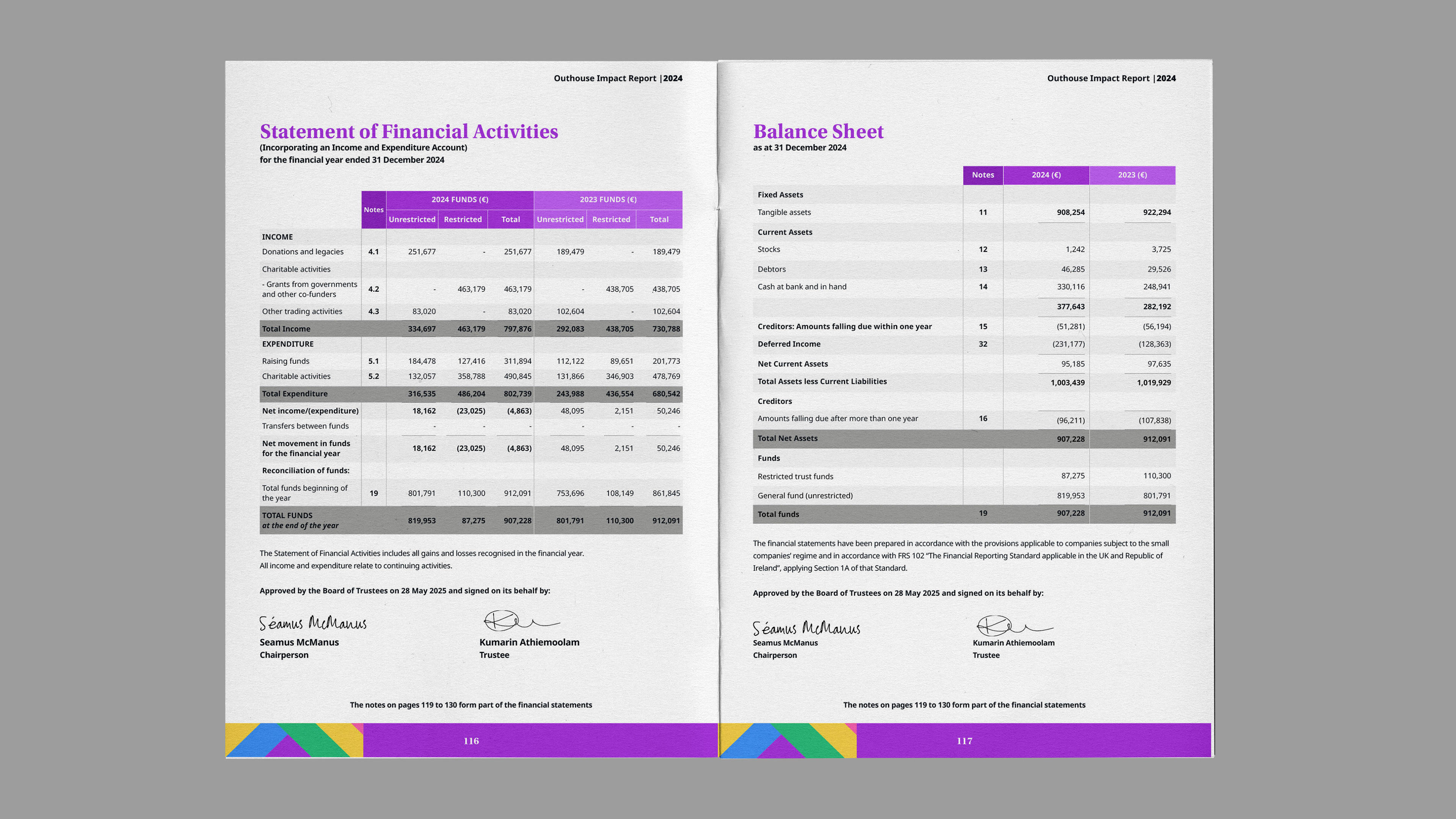The report is designed to be clear, engaging and easy to move through. One of the main challenges was presenting important data and financial information in a way that stayed easy to navigate and accessible, while still feeling vibrant and true to Outhouse’s existing visual identity.